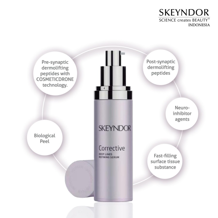 Kombinasi antara peptida dan bahan aktifnya menghentikan saraf bekerja untuk mengurangi garis ekspresi. Dengan exfoliator alami / Biological peel merangsang regenerasi kulit dan meratakan warna kulit.